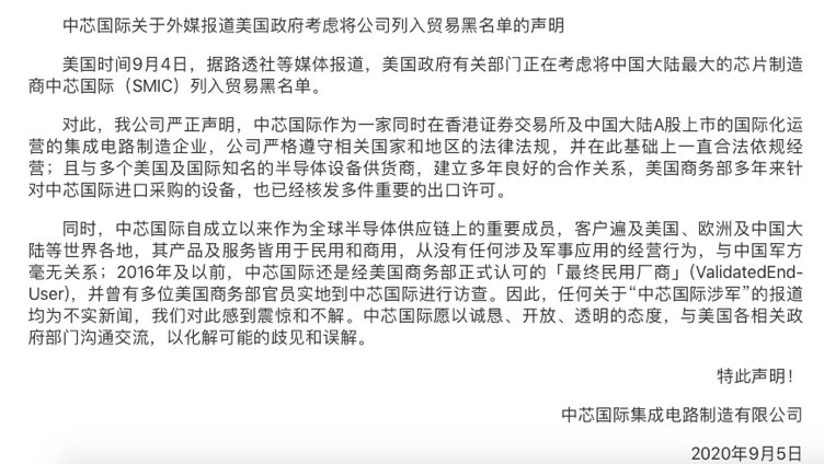 中芯国际也曾就公司列入贸易黑名单发布声明,将继续与美国商务部合作,并重申公司和中国军方毫无关系,也没有为任何军用终端用户生产。