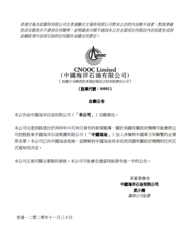 当天,中海油立即发布回应称,公司已向中国海油查询,并了解到中国海油尚未收到美国有关政府机构的任何正式通知或决定。公司正密切关注事态的发展,将可能会在适当时候发布进一步的公告。