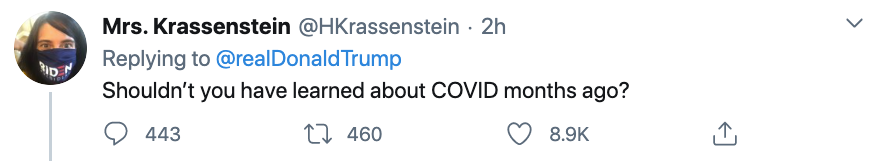 “你什么都没学到。你根本不知道那死去的21万美国人经历了什么!或者感染的人经历了什么,他们没有你这样的医疗条件,也没有医疗保险,有的人甚至无法得到检测!”