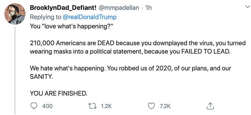 “你爱现在正发生的这一切?21万美国人死了,就因为你轻蔑病毒,你将戴口罩这件小事升级成政治问题,因为你根本不配当个领导人!”