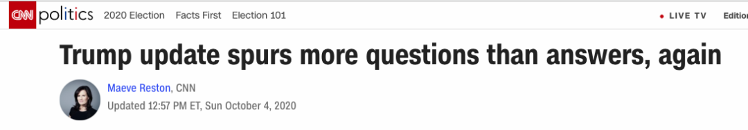 在周日的这场发布会上,川普的医生说出了两个重点,一是,川普曾在周五和周六有过两次因高烧导致的血氧水平下降。第二件事就是,川普最早明天(周一)就可以出院了!