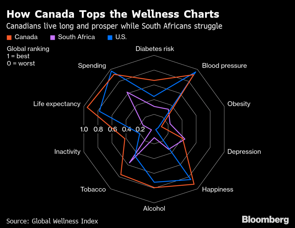健康国家排名,依据是血压、平均寿命、政府保健投入、抑郁症比例、吸烟率、运动率等等。加拿大除了抑郁症这个单项表现一般外,其他单项都是全球标杆。