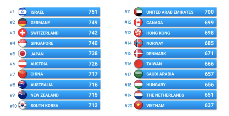根据Deep Knowledge Group的研究,该研究是讨论的起点,可以作为“政府优化当前和大流行后安全与稳定的资源,并且可以作为为每个特定地区制定最佳可行行动计划的工具,以维持其人口的健康和经济福祉,并扭转COVID-19造成的附带损害。”以色列名列榜首,总得分751分(满分为1000),其次是德国(749)和瑞士(742)。