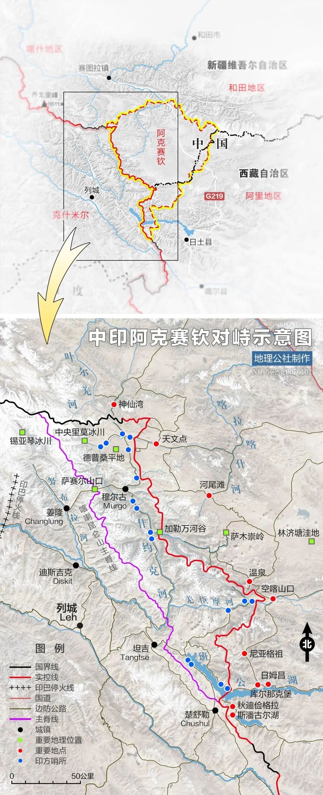 阿克赛钦是新疆南部、西藏西部和克什米尔的连接部,地理位置极为重要。中印实控线位于喀喇昆仑主脊线以东,大致沿什约克河和喀拉喀什河、叶尔羌河的分水岭展开。
