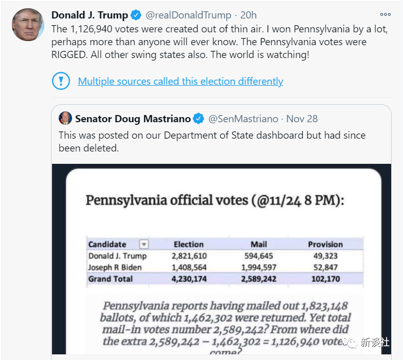 根据宾夕法尼亚州计算的2,589,242张邮寄选票总数,这意味着有1,126,940张不存在的邮寄选票被计算在内。This was posted on our Department of State dashboard but had since been deleted. pic.twitter.com/bDmvCK0kDB