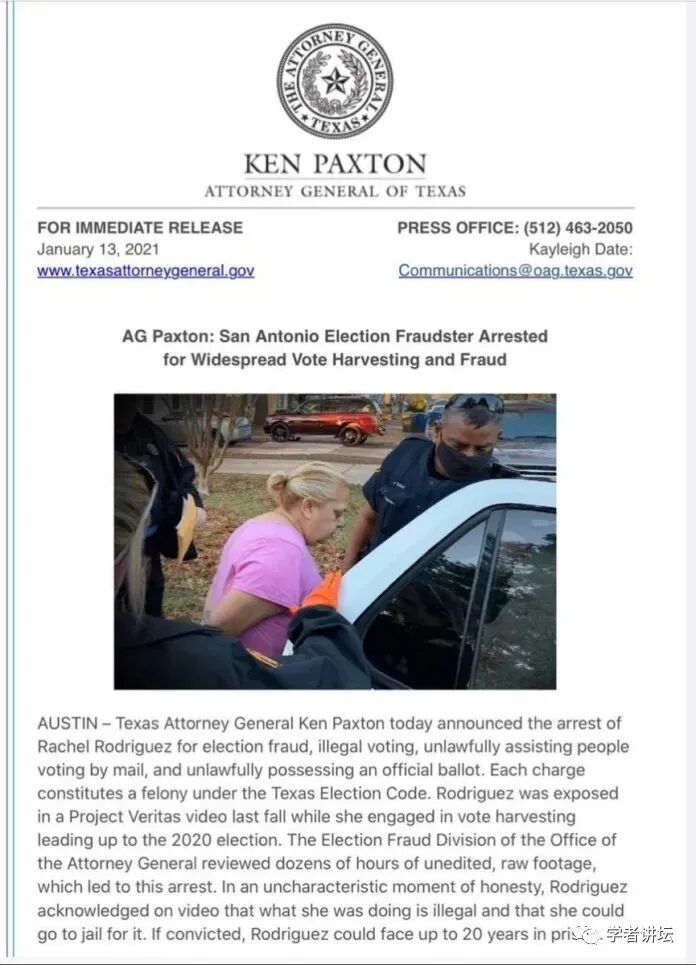 帕克斯顿总检察长发布一份新闻简报称,雷切尔·罗德里格斯因为涉嫌选举舞弊、非法投票、非法协助他人邮寄投票及非法拥有选票被捕;罗德里格斯已经认罪,面临最高20年的刑期。