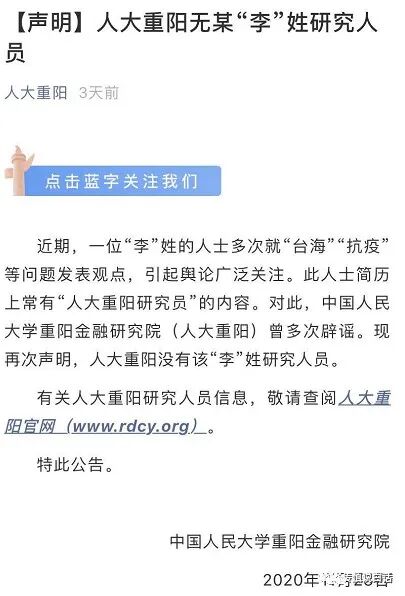 11月23日,中国人民大学重阳金融研究院官方公号刊发一则声明称:近期,一位“李”姓的人士多次就“台海”“抗疫”等问题发表观点,引起舆论广泛关注。此人士简历上常有“人大重阳研究员”的内容。对此,中国人民大学重阳金融研究院(人大重阳)曾多次辟谣。现再次声明,人大重阳没有该“李”姓研究人员。