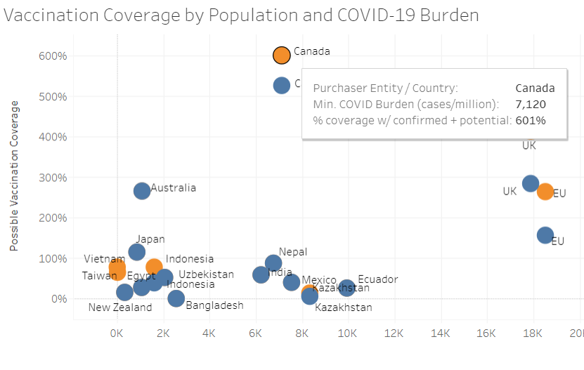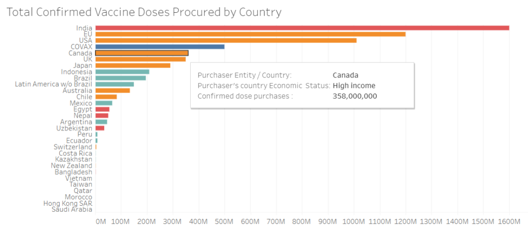 *COVAX的这项数据可能有些滞后,因为根据最新消息,截止9月份,加拿大已经和阿斯利康、赛诺菲、葛兰素史克、强生、诺瓦瓦克斯、辉瑞和Moderna等公司签订协议,总计订购了3.58亿剂的疫苗,人均接近10支。印度订购最多,16亿支