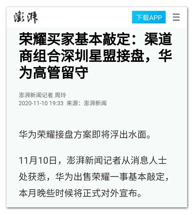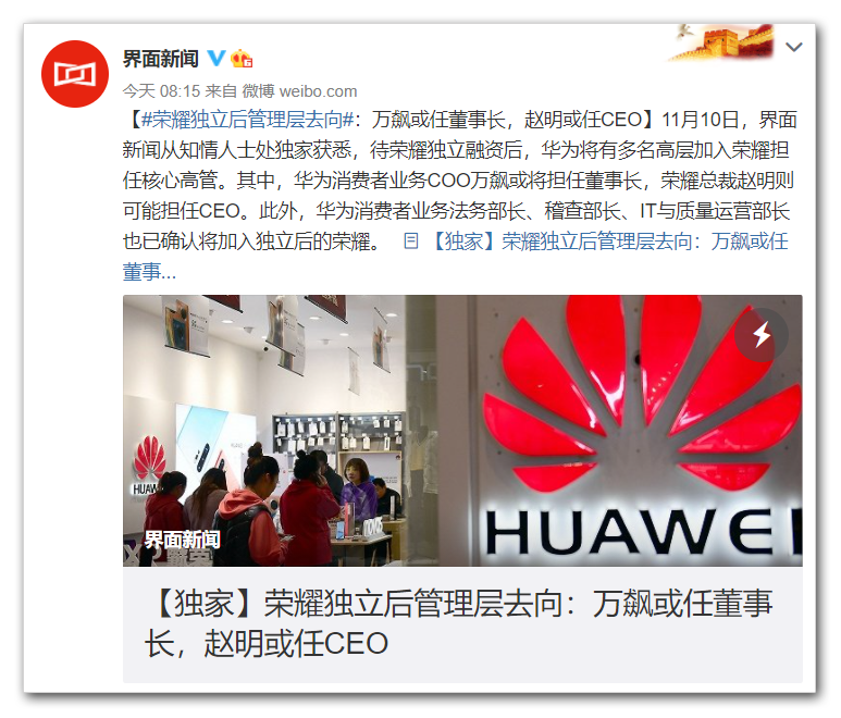 第三个是界面新闻: 11月11日,界面独家报道:华为出售荣耀一事已成定局,现总裁赵明将赴新荣耀履职。