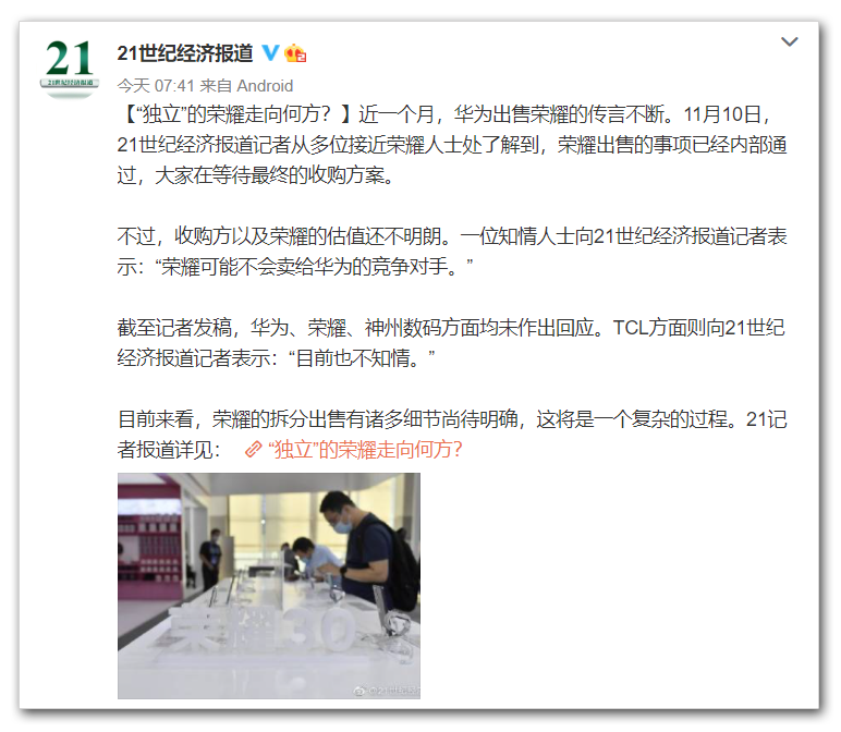 1.重磅:华为出售荣耀!“最好的情况是市场份额降低,最坏情况是退出手机市场。”——这一天终于来了! 最近,多家权威媒体报道,华为正在出售旗下荣耀手机!第一个报道的是澎湃新闻: 11月10日,澎湃记者从内部获知,华为出售荣耀一事已基本敲定,并将在11月正式官宣。第二个是21世纪经济报道: 澎湃之后,21世纪经济披露,荣耀出售事项在内部通过,已进入签字阶段。