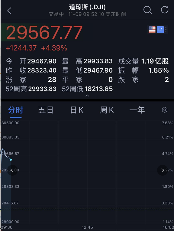 美股开盘之后,受利好刺激,开盘大涨超1600点,截至发稿,道指涨超1200点,稍有回落,标普500涨超3%。