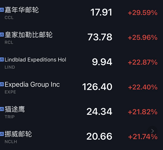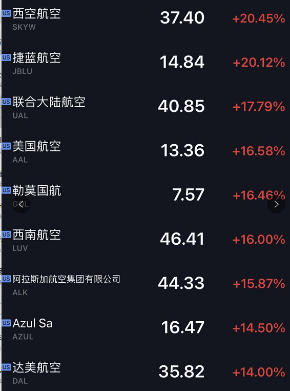 而美股航空股、邮轮股大涨,忠诚航空、美国联合航空(UAL.O)涨超25%,美国航空集团(AAL.O)涨22%,达美航空(DAL.N)、西南航空(LUV.N)涨超20%;嘉年华邮轮、挪威邮轮均涨超20%。