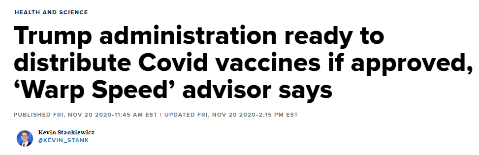 白宫新冠病毒疫苗计划“曲速行动”行动负责人斯劳伊(Moncef Slaoui)博士表示,计划将在预期的FDA批准后的24小时内将疫苗运送到各州。