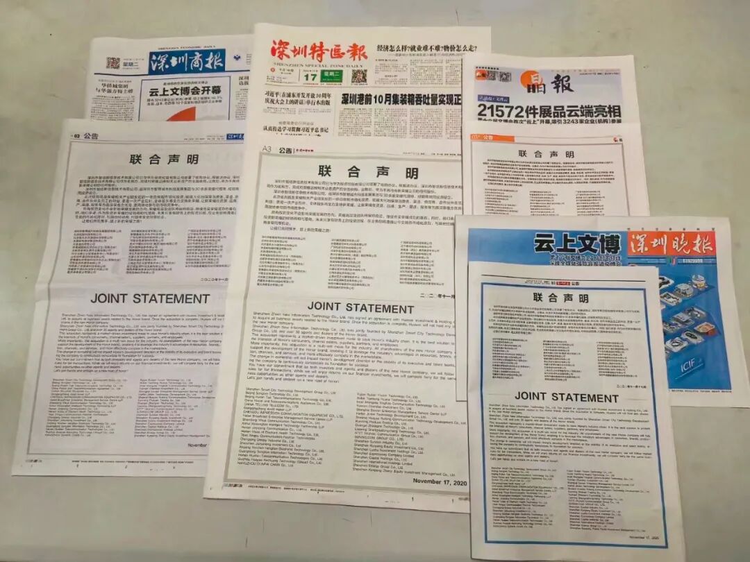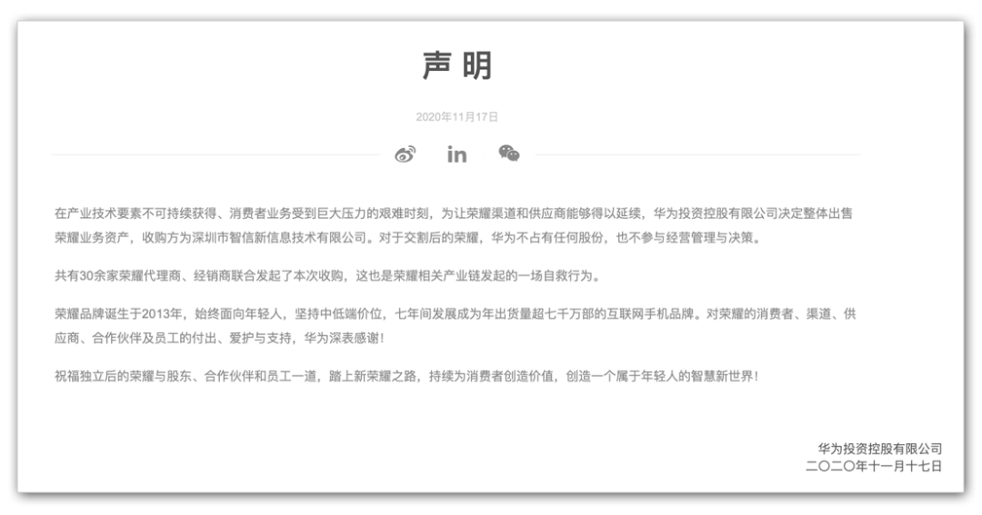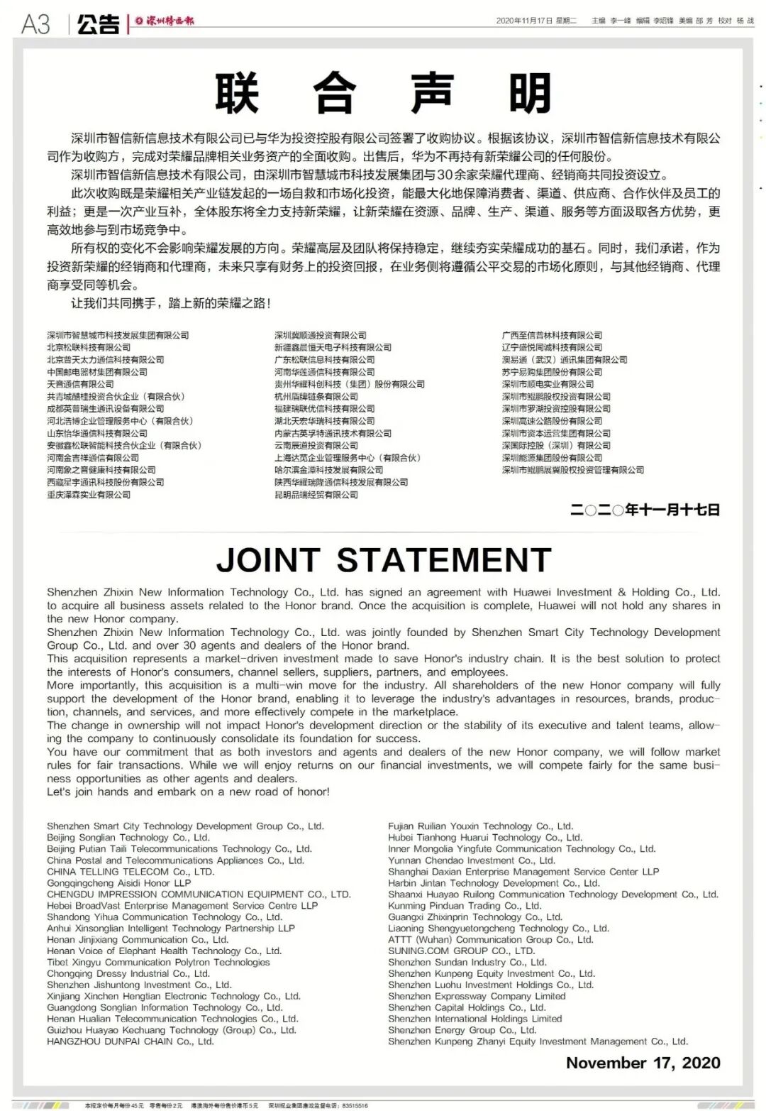 11月17日,40家企业在《深圳特区报》发布联合声明:已与华为签署协议,共同收购荣耀品牌全部业务资产。